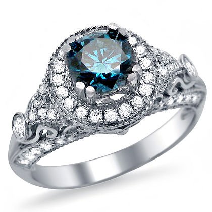 1.35ct Blue Round Diamond Engagement Ring 14k White Gold Vintage StyleProduct DescriptionThis item is a new certified 1.35ct blue and white diamond ring set in 14k white gold. A sparkling excellent cut .75ct blue round diamond is set atop the ring. Surrounding it on the top, sides, front and back are .60cts of round pave and bezel set diamonds. They are excellent quality SI-1 - SI-2 clarity and G-H color. All of the diamonds in the ring are 100% natural, and the blue diamond is a natural diamond that was color enhanced to achieve its fancy blue color. It's accompanied by a full independent gemological laboratory UGL diamond certificate and separate Front Jewelers store appraisal. Both state its characteristics and appraisal value of $4,295. This fantastic ring is 100% risk-free because of our 30 day return policy, and due to our customer satisfaction guarantee. Customer Reviews This review is from: 1.35ct Blue Round Diamond Engagement Ring 14k White Gold Vintage Style (Jewelry)